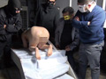 頭にも鉄線を巻き付けてさらにタッカーの針を乳房に何本も刺して電気ショック責めをすると悶え苦しむ。