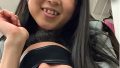 奴隷のように扱われる男はパンツ姿でテープで目隠しされ首輪を付けた姿で床に座ると、OLが近づいて男の頬を指で掴んでつねる。