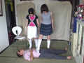 テーブルを片付けて広くなった部屋の畳の上に教師は命令されて仰向けになると、立ち上がった女子達は汚い物を見るような目で教師を見下ろしながら激しく罵倒した。