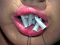 大量の針が貫通して唇の周りからとがった針先が出てきて唇が充血して腫れていく。
