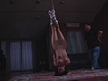 唯一身に着けている靴下を履いた足を縄で縛り頭が床に当たる状態で逆さ吊りして髪の毛を持って体を揺らす。